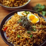 - Optionally scramble an egg into the noodles for richness. Finish with chopped green onions and serve hot.