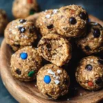 You’ll start by stirring the wet ingredients and oats until they form a sticky base. Next, add protein powder to firm things up and give the balls substance. Fold in mini chocolate chips, M&Ms and optional nuts for texture and color. Finally, scoop, roll and chill so the bites set up. No baking required; chilling is the only “cook” time.