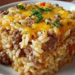 I grew up with casseroles like this on busy weeknights — quick to scoop, easy to stretch, and always disappearing first. Cheesy Hamburger Rice Casserole pairs simple pantry ingredients with that comforting, baked-cheese finish everyone loves: browned beef, tender long-grain rice cooked in savory broth and cream-of-mushroom soup, then topped with melty cheddar. It’s the kind of dish you make when you want something filling, budget-friendly, and reliably kid-approved. If you prefer a slightly different spin, see this version for another home-cooked take.