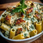 Notes and substitutions: use rigatoni for more sauce capture, or penne if you prefer smaller tubes. Swap half-and-half for whole milk if you want slightly lighter sauce but keep the heavy cream for silkiness. For a vegetarian version, replace chicken with roasted mushrooms or extra spinach and toss in a can of drained white beans.