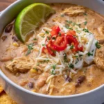 This version balances ease and richness. The slow cooker does the heavy lifting: simmering chicken until tender, letting spices bloom, and blending cream cheese at the end for a luscious texture. It’s budget-friendly (canned beans and tomatoes), kid-approved (mild but flavorful), and very forgiving—perfect for busy weeknights, potlucks, or game-day crowds. The cream cheese keeps the chili velvety without needing heavy cream, and it pairs beautifully with quick garnishes for a restaurant-style finish at home.