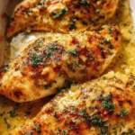 This recipe delivers big flavor with minimal fuss. The garlic butter keeps the lean breasts moist while adding savory richness that kids and adults both enjoy. It’s quick (about 30–35 minutes total), budget-friendly, and easy to scale up for guests. Because you’re baking at a high temperature, the outside gets a light golden finish and the inside stays juicy — great when you want a no-fuss main that pairs well with almost anything.