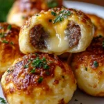Bite-sized cheesy balls of beef and garlic wrapped in buttery biscuit dough, perfect as an appetizer or a quick meal.