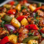 I grew up near the coast where fresh pineapple showed up at potlucks, and this Hawaiian-style sheet pan chicken always stole the show. It’s a simple, sweet-savory tray-bake: juicy chicken breasts glazed in a pineapple-soy mixture with red onion, colorful bell pepper, and caramelized pineapple chunks. People make it for easy weeknight dinners, low-effort entertaining, or when you want a tropical twist without firing up the grill. If you want a similar sheet-pan approach with slightly different seasoning, check this Hawaiian chicken sheet pan for inspiration.
