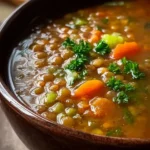 I grew up with a pot of lentil soup simmering on the stove whenever the weather turned crisp. This version is simple, forgiving, and exactly the kind of recipe you make when you want something warm, nutritious, and wallet-friendly without fuss. It uses pantry staples, cooks in about 35 minutes, and finishes into a bowl that’s cozy enough for weeknights but homey enough for guests.