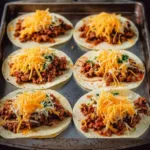 - Arrange taco shells on the warmed sheet pan, fill each with the beef mixture, and top with shredded cheese.