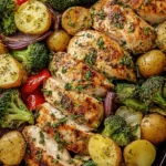 A one-pan meal of chicken, baby potatoes, and mixed vegetables roasted in a buttery garlic infusion for a delightful weeknight dinner.