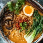 Serve this ramen in shallow bowls so the toppings show. Top with extras like toasted sesame seeds, a drizzle of chili oil, or a lime wedge for brightness. For crunchy contrast, scatter crisped garlic chips or fried shallots on top. If you’re feeding a mixed crowd, offer optional add-ins—soft tofu for vegans, or a side of crispy plant-based “chicken” bites for omnivores—so everyone customizes their bowl. For a casual spread, pair with small finger foods or buns; this can make a fun, interactive dinner when friends gather. You can even balance the heat with cooling cucumber salad or pickled vegetables.